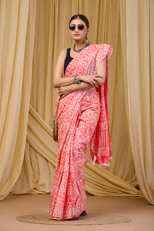 Cotton MulMul Pink Printed Sarees