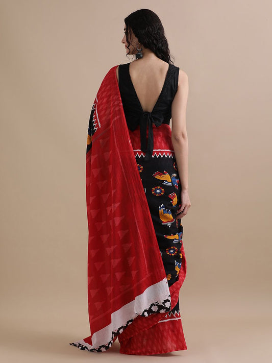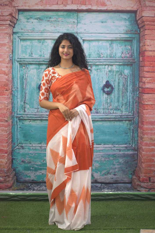 Printed Orange Ikkat Print Cotton MulMul Saree