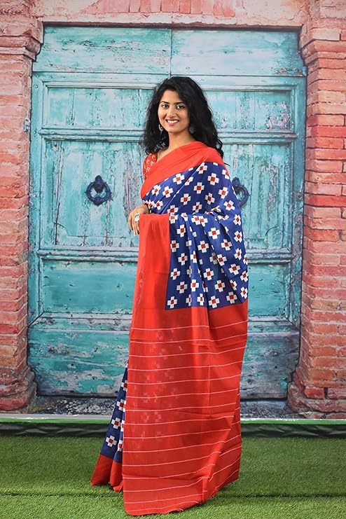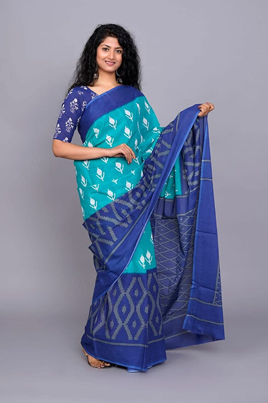 Printed Blue Ikkat Print Cotton MulMul Saree