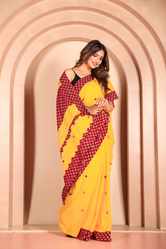 Ajrakh Patch Work Yellow Cotton MulMul Saree