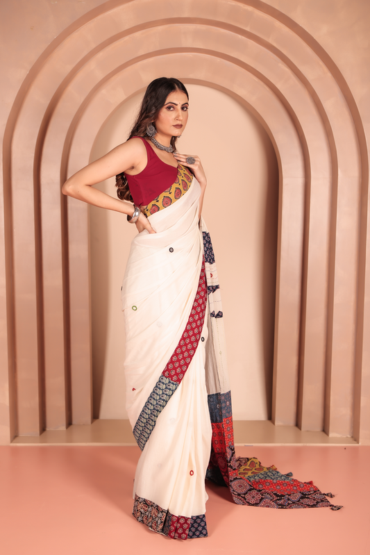 Ajrakh Patch Work White Cotton MulMul Saree