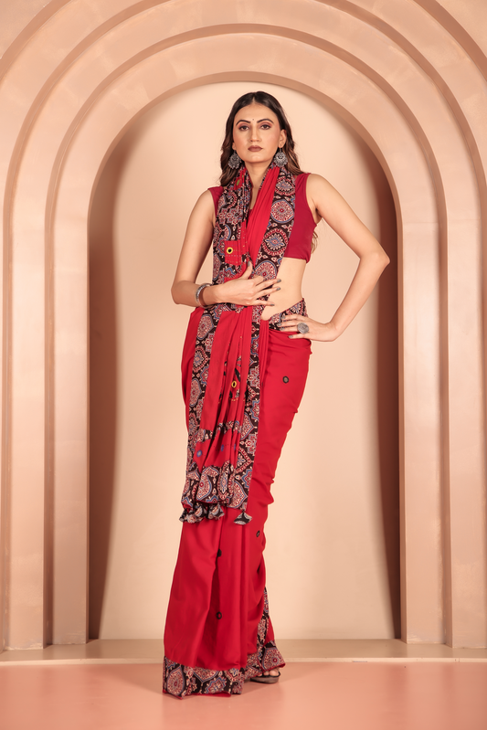 Ajrakh Patch Work Red Cotton MulMul Saree