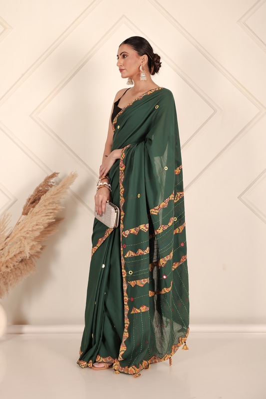 Ajrakh Patch Work Green Cotton MulMul Saree