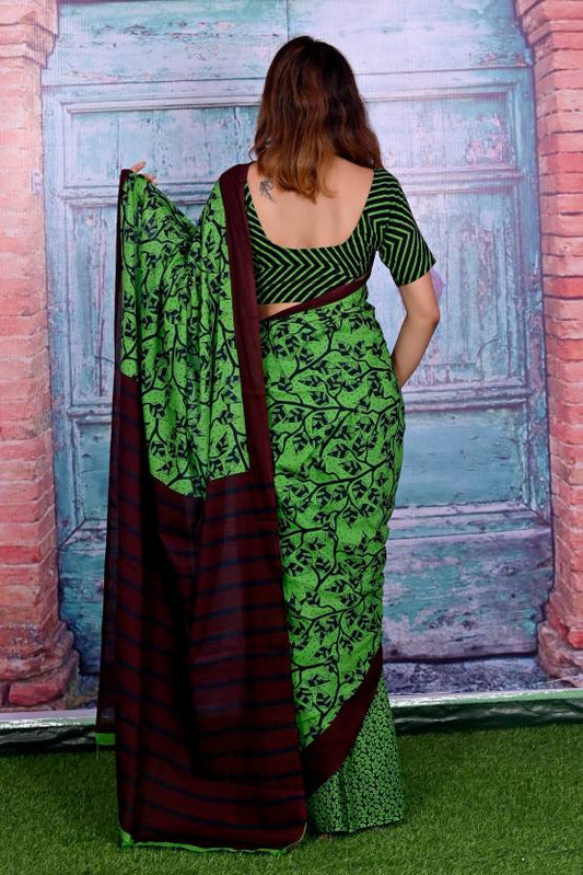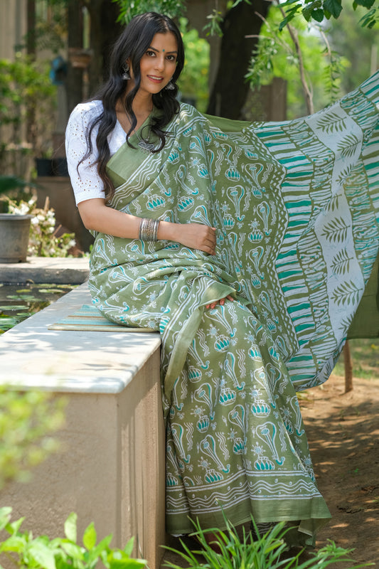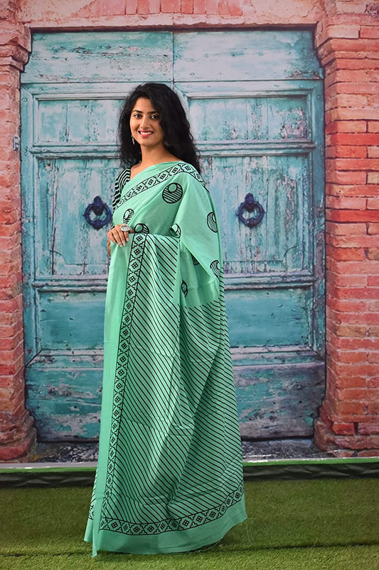 Printed Sea Green Dabu Print Cotton MulMul Saree