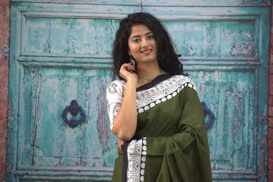 Printed Mustard Dabu Print Cotton MulMul Saree
