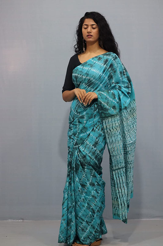 Printed Sky Blue Shibori Print Cotton MulMul Saree