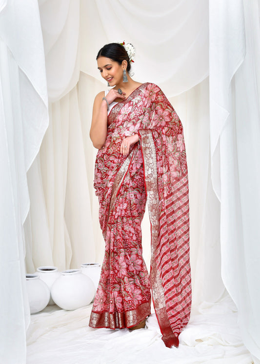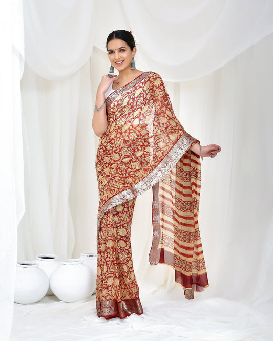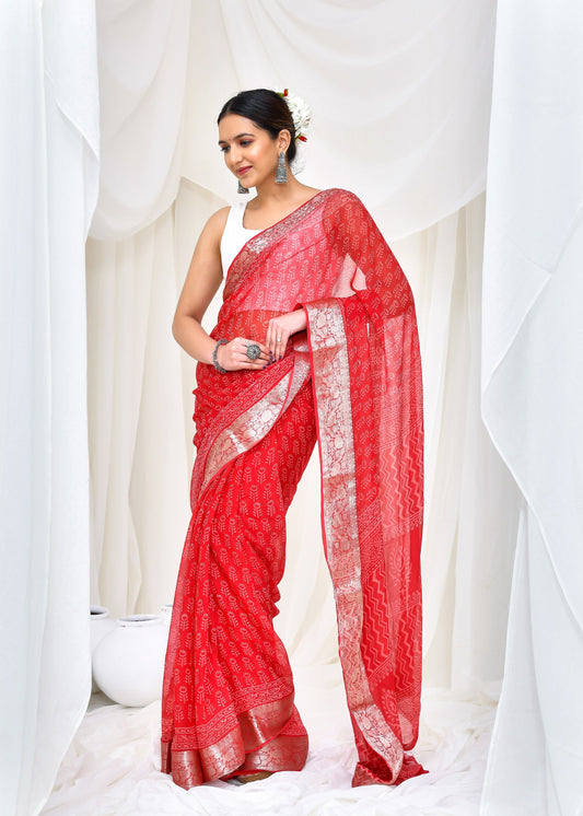 Printed Red Ajrak Print Cotton MulMul Saree
