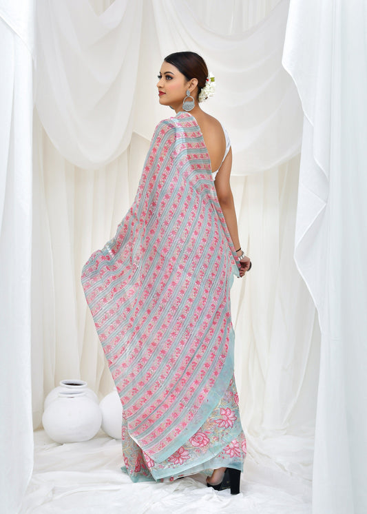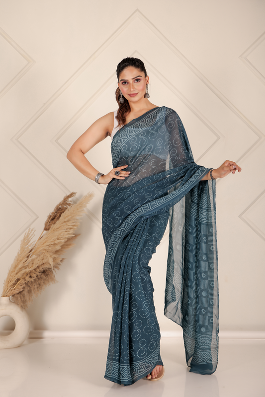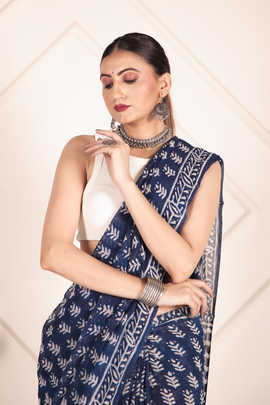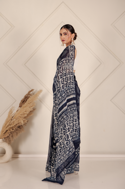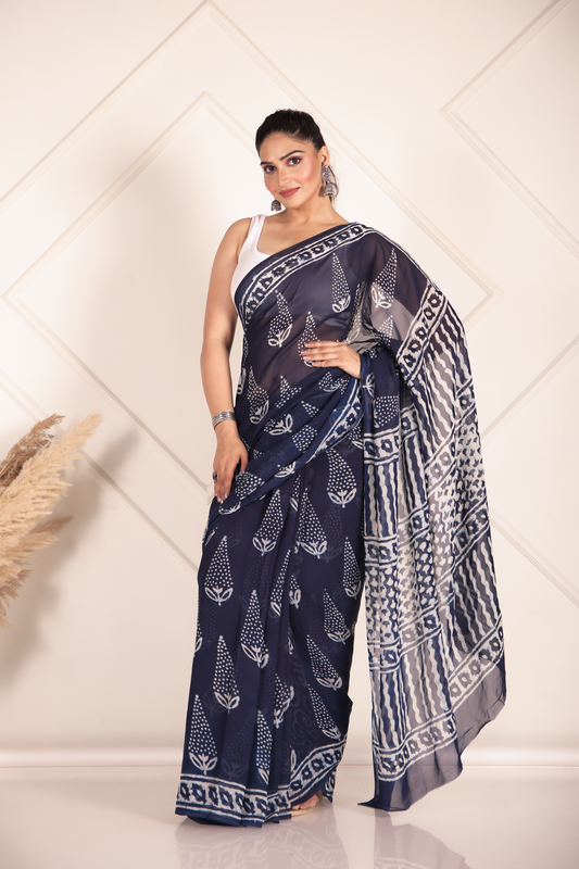 Printed Blue Dabu Print Cotton MulMul Saree