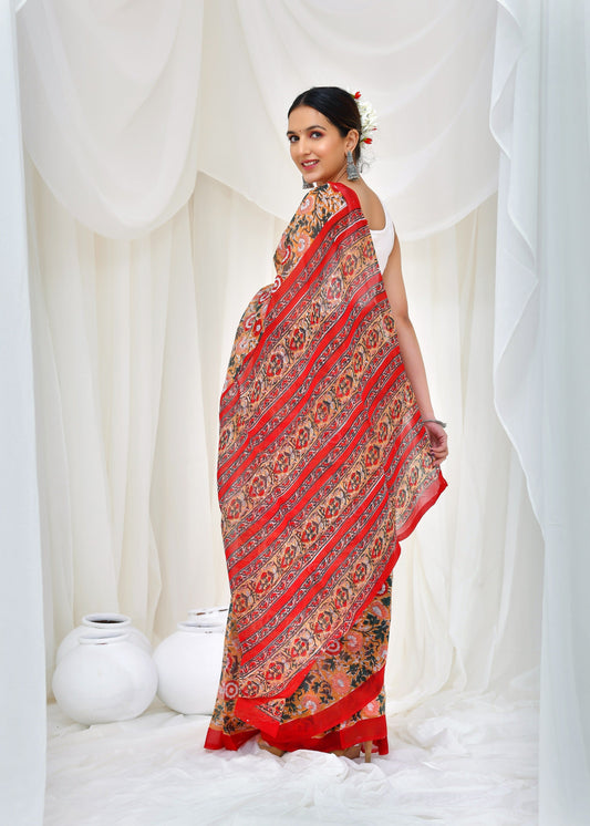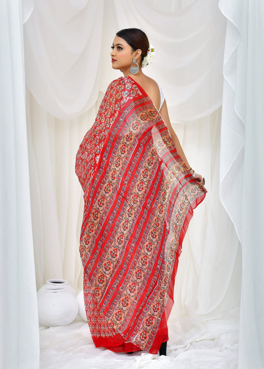 Printed Red Ajrak Print Cotton MulMul Saree