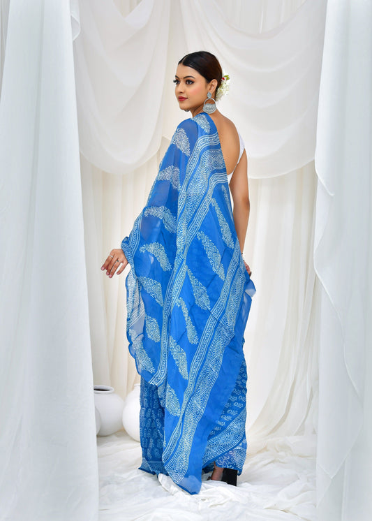 Printed Blue Dabu Print Cotton MulMul Saree