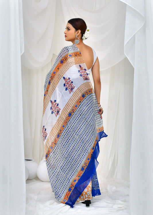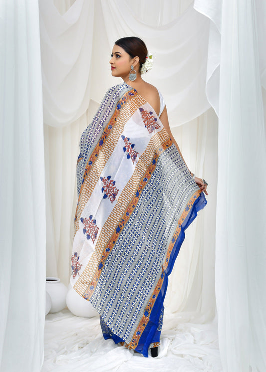 Printed White Batik Print Cotton MulMul Saree