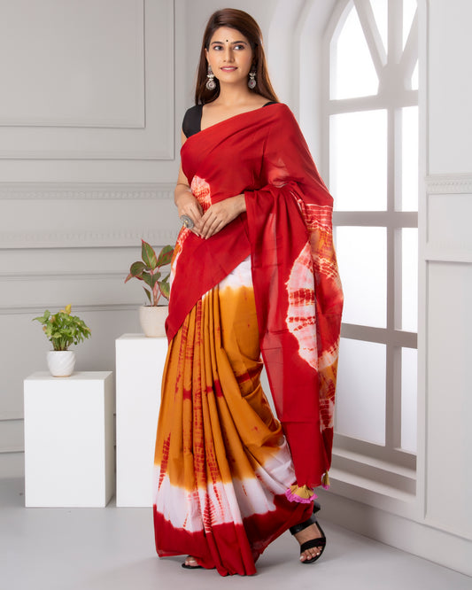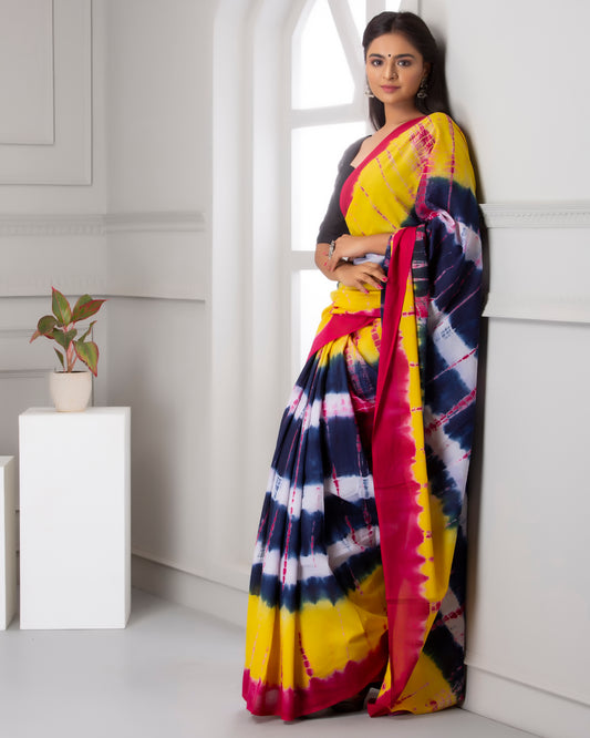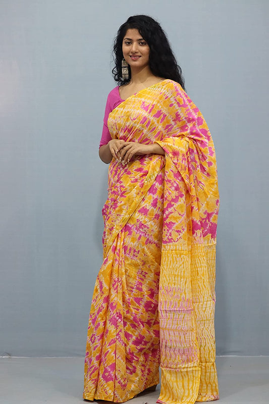 Printed Yellow Shibori Print Cotton MulMul Saree