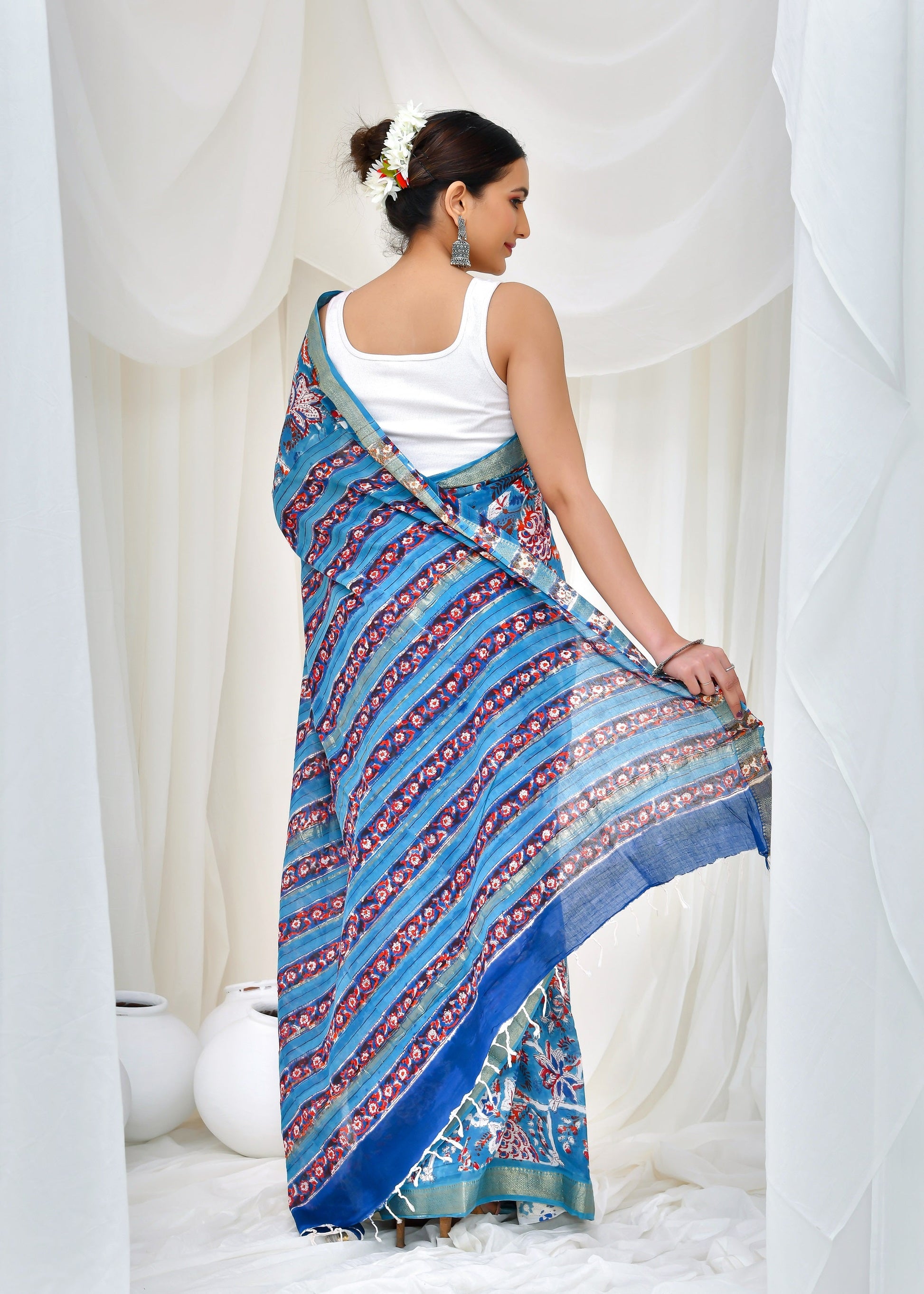 from 228 reviewsPrinted Blue Dabu Print Cotton MulMul Saree