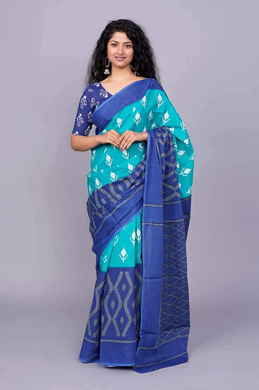 Printed Blue Ikkat Print Cotton MulMul Saree